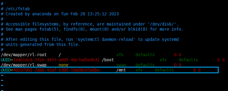 부팅 시 파일 시스템이 자동으로 마운트 되도록 하려면 /etc/fstab 파일에 마운트 항목을 추가해야 합니다.