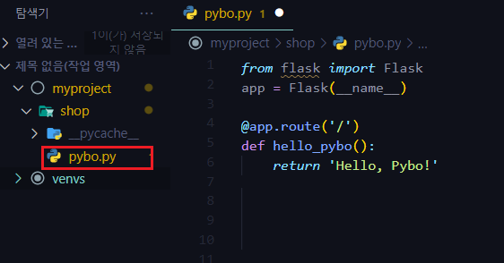 이 때 만든 pybo.py 파일을 pybo 디렉토리를 만들어서 그 안에 넣어줄 겁니다.