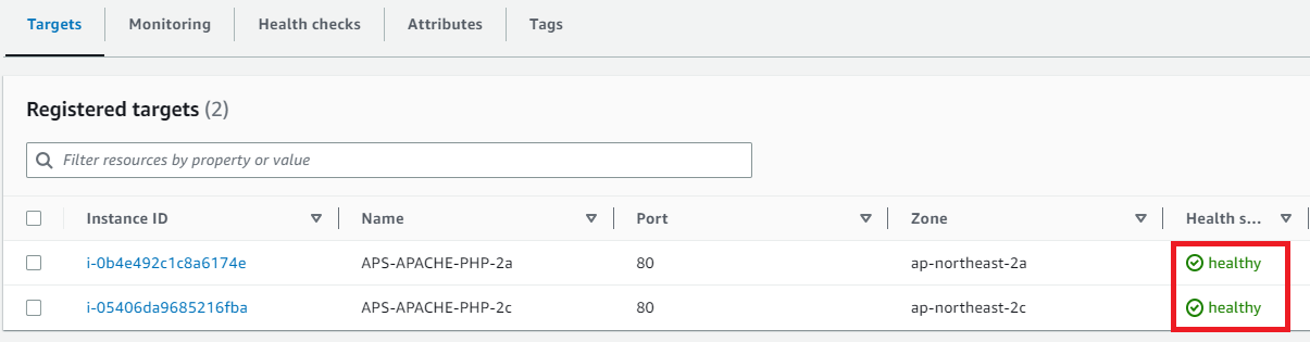 ec2 > Target Groups 에서 Health status가 healthy인지 확인.