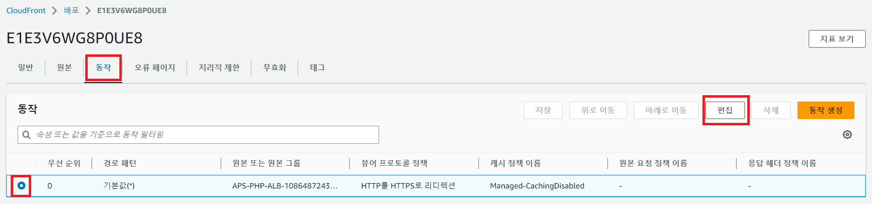 CloudFront의 동작 태그에서 뷰어 프로토콜 정책과 캐시 확인.